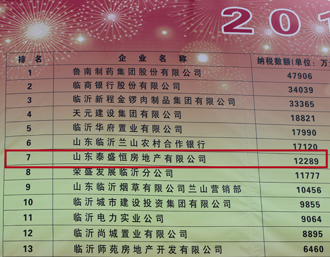 近日,從蘭山區統計局公布的統計數據顯示,山東泰盛恒房地產有限公司以12289萬元的納稅額榮登蘭山區2014年度納稅千萬以上企業第7名。